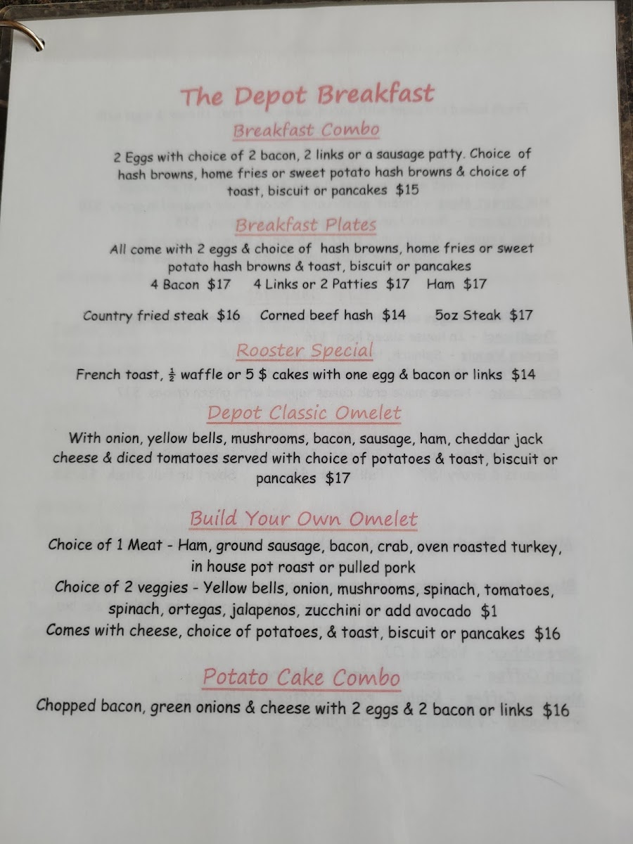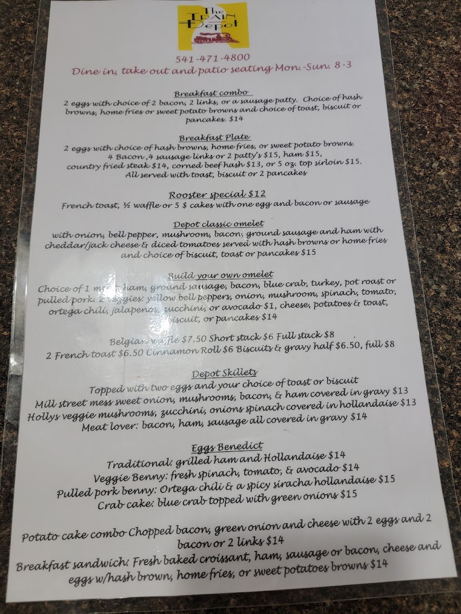 Introducing The Depot Eatery, a charming dining gem nestled in Grants Pass, Oregon. Here, traditional diner vibes meet remarkable culinary creativity. Their extensive breakfast menu features a standout Breakfast Combo, offering two eggs cooked to perfection paired with savory options like crispy bacon or sausage, complemented by your choice of hash browns or sweet potato hash. Priced affordably at US$16.00, it promises a fine start to your day.